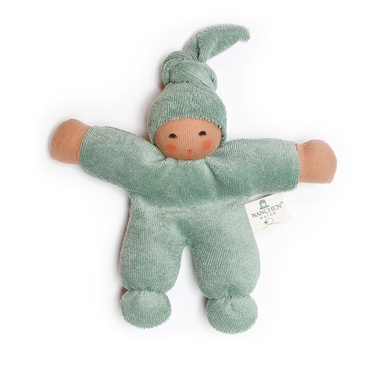 La bambola Pimpel Salbei con pelle abbronzata, è realizzata in cotone biologico e morbidissima lana vergine biologica, tinti naturalmente. Il colore salvia dei vestiti conferisce a questo piccolo doudou Nanchen un aspetto molto morbido e confortante.