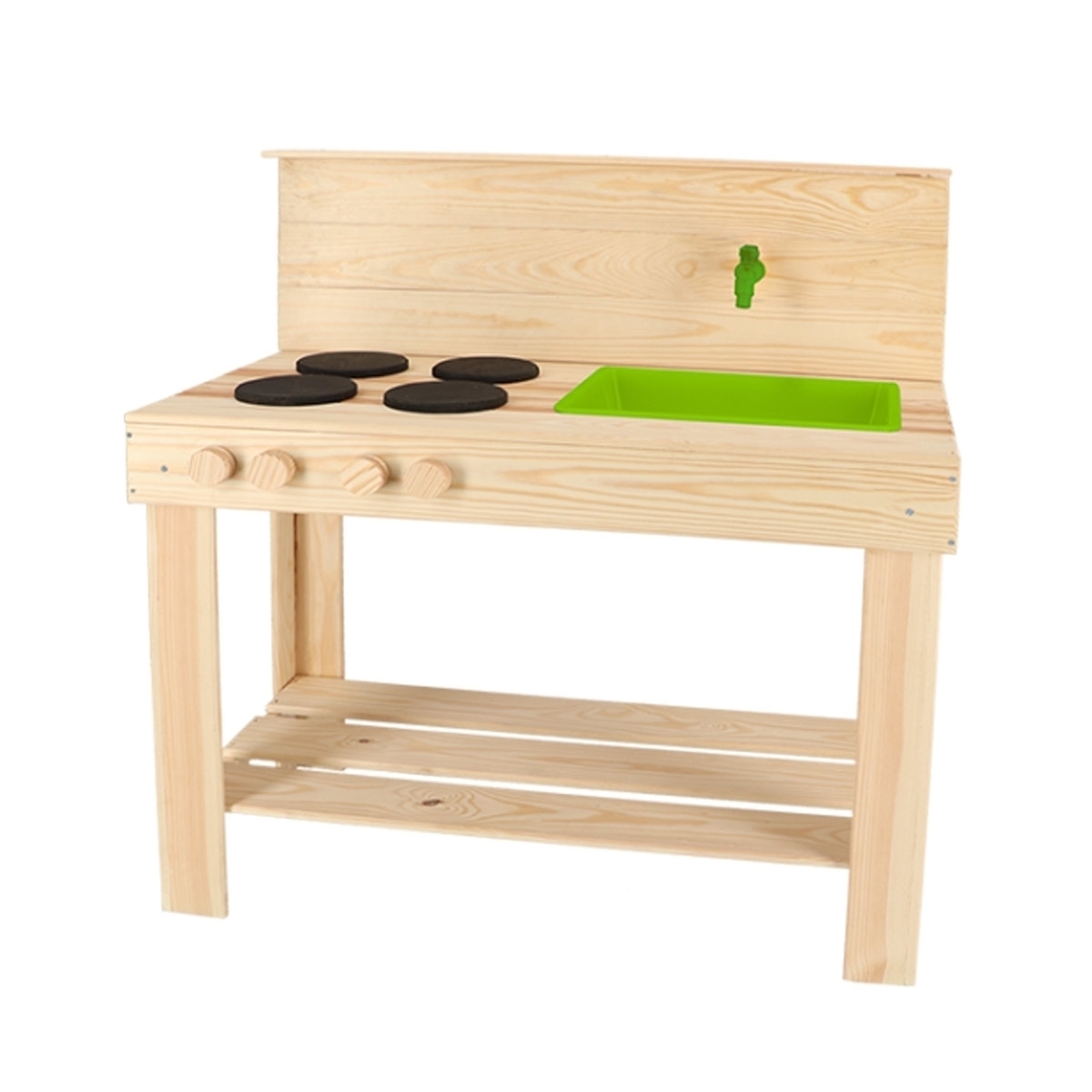 Cuisine de boue en pin massif avec 4 boutons rotatifs, 4 plaques de cuisson en bois noir, un évier en plastique vert, avec un robinet qu'on peut raccorder à un tuyau d'arrosage, une parois arrière et sous le plan de travail une grande étagère de rangement.